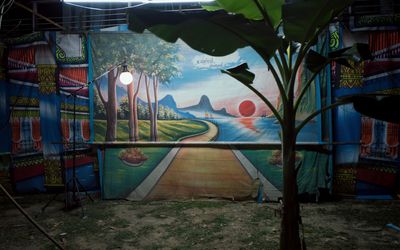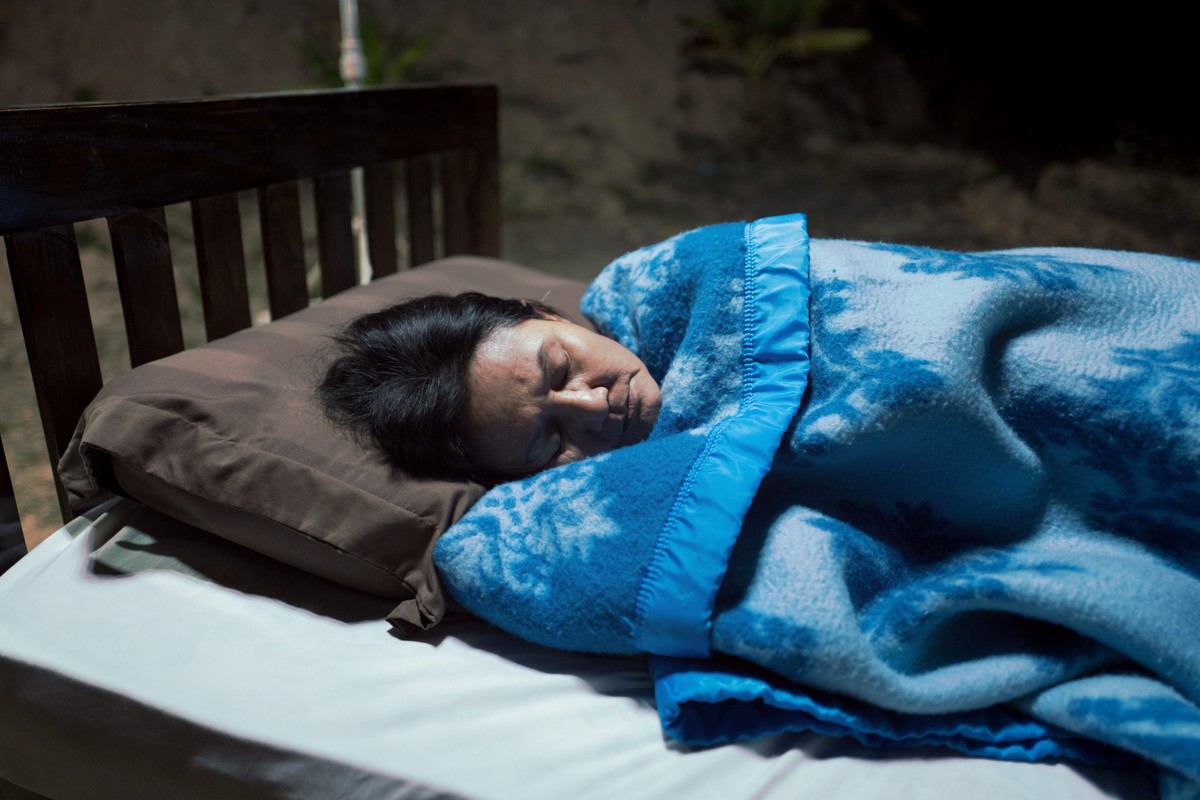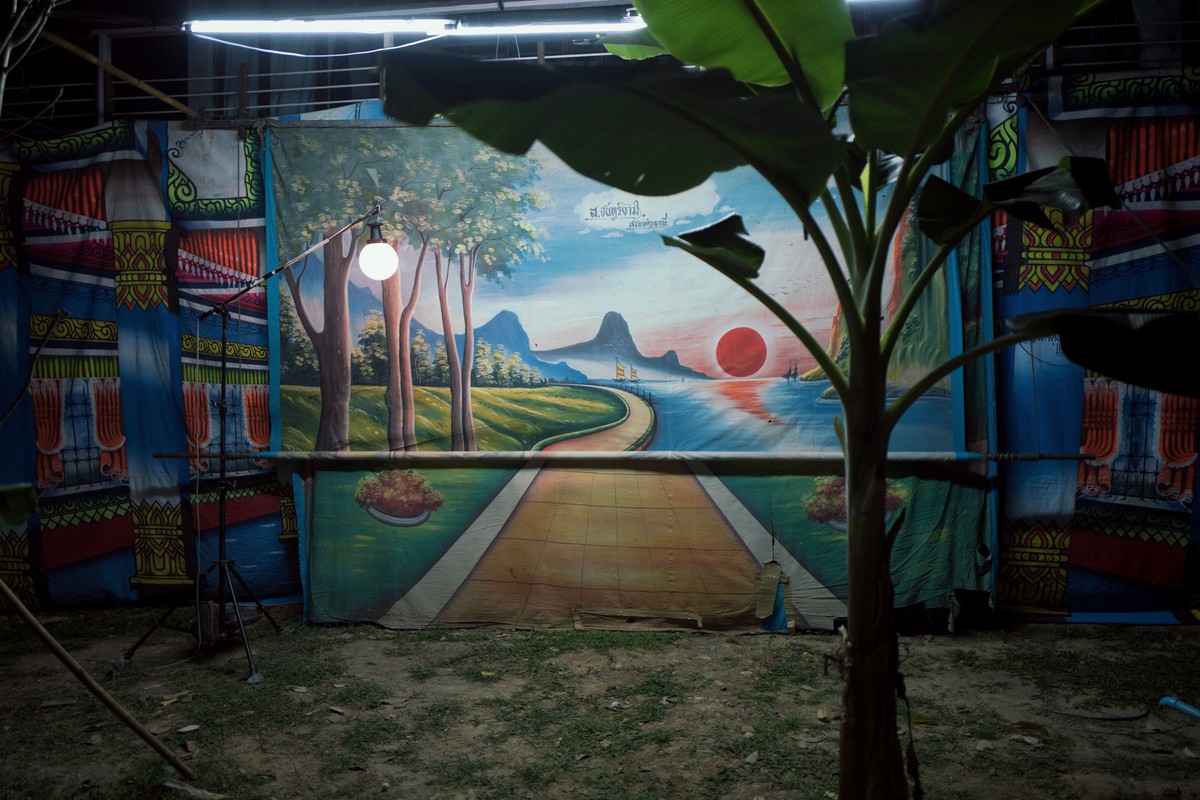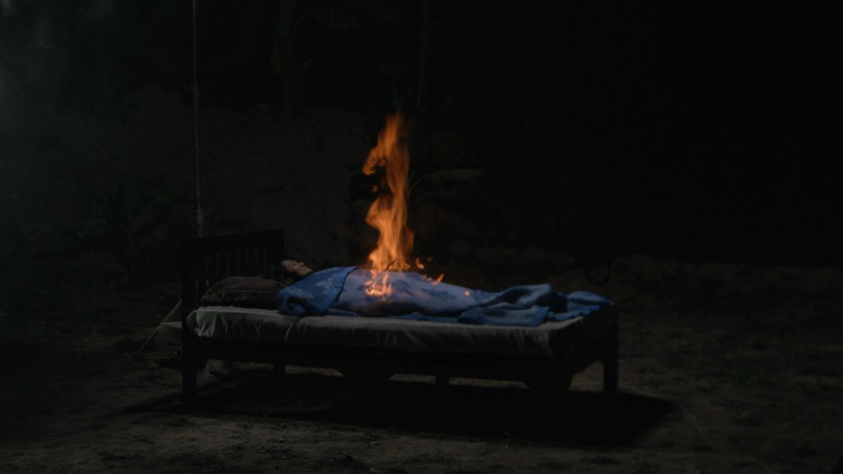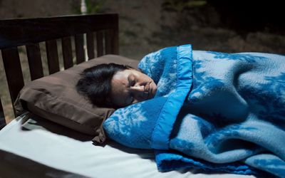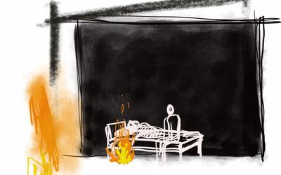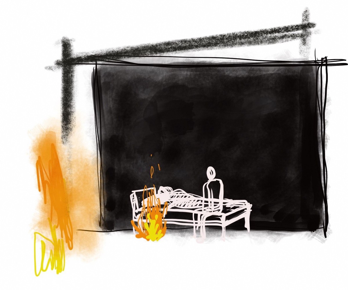 A woman lies awake at night. Nearby, a set of theatre backdrops unspools itself, unveiling two alternate landscapes. Upon the woman’s blue sheet, a flicker of light reflects and illuminates her realm of insomnia.